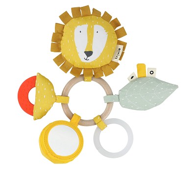 Beskrivelse Morsom aktivitetsleke til de aller minste fra Trixie. Leken er enkel å gripe for små hender og har flere fine og myke detaljer som stimulerer babyen på ulike måter. På aktivitetsleken er det festet ulike figurer og leker; en biteleke, et speil, en rangle som lager lyd og myke kosedyr. Søte figurer med forskjellig tekstur, som holder på barnets oppmerksomhet lenge. Lekene er festet til en praktisk ring. Materiale: 100% bomull, fyll 100% polyester. |