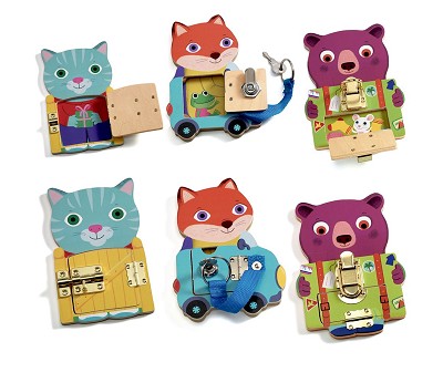 Beskrivelse Med disse søte dyrefigurene fra Djeco kan barna lære seg basiskunnskaper! Her kan de øve seg på å åpne ulike låser. Figurene er laget i tre, malt i fine farger og er laget slik at barna skal åpne kattehuset til katten, bildøren til reven og kofferten til bjørnen med de ulike låsemekanismene. Dette er fine øvelser for finmotorikken! Hver figur måler ca 16 x 11 cm. |