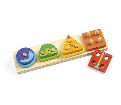 Beskrivelse Et puslespill i tre med åtte brikker i fire forskjellige fasonger. Hver brikke har et visst antall hull i seg og det er om å gjøre for barnet å plassere riktig brikke på riktig sted ved å tre den på trepinnene som er limt på pusleplaten. Det er to brikker per plass på platen, den ene er ensfarget og den andre har motivet av et dyr. Begge brikkene har samme fasong og lignende farge for å gjøre det litt enklere for barnet. Dette er et puslespill som utvikler finmotorikk og form- og fargeforståelse, i tillegg til at den kan være en god introduksjon til å lære å telle. |