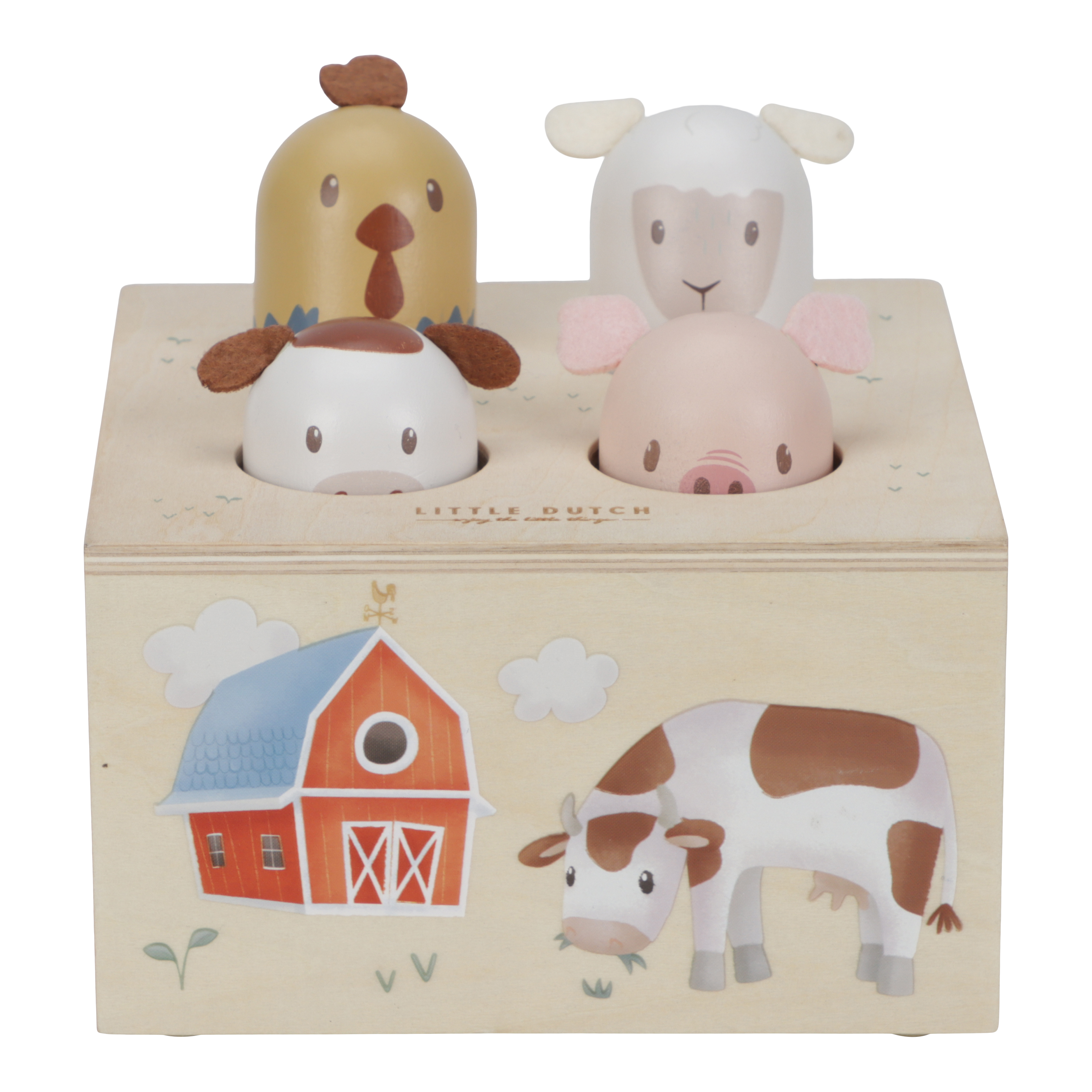 Beskrivelse Disse fire søte bondegårdsdyrene er klare for lek! Med et forsiktig trykk dukker ett dyr ned, mens et annet spretter opp – en morsom overraskelse hver gang. Bli kjent med alle dyrene og lydene deres: kuas rolige «mø», sauens myke «bæ», grisens glade «øff øff» og kyllingens lille «pip pip». Den solide trekassen er dekorert med sjarmerende illustrasjoner fra Little Farm-universet, laget for å fange barnets oppmerksomhet og fantasi. De morsomme pop-up-bevegelsene og de gjenkjennelige dyrelydene gir både latter og læring. Leken stimulerer barnets nysgjerrighet og bidrar til å utvikle både forståelse av årsak og virkning og tidlige kognitive ferdigheter – alt gjennom lek. |