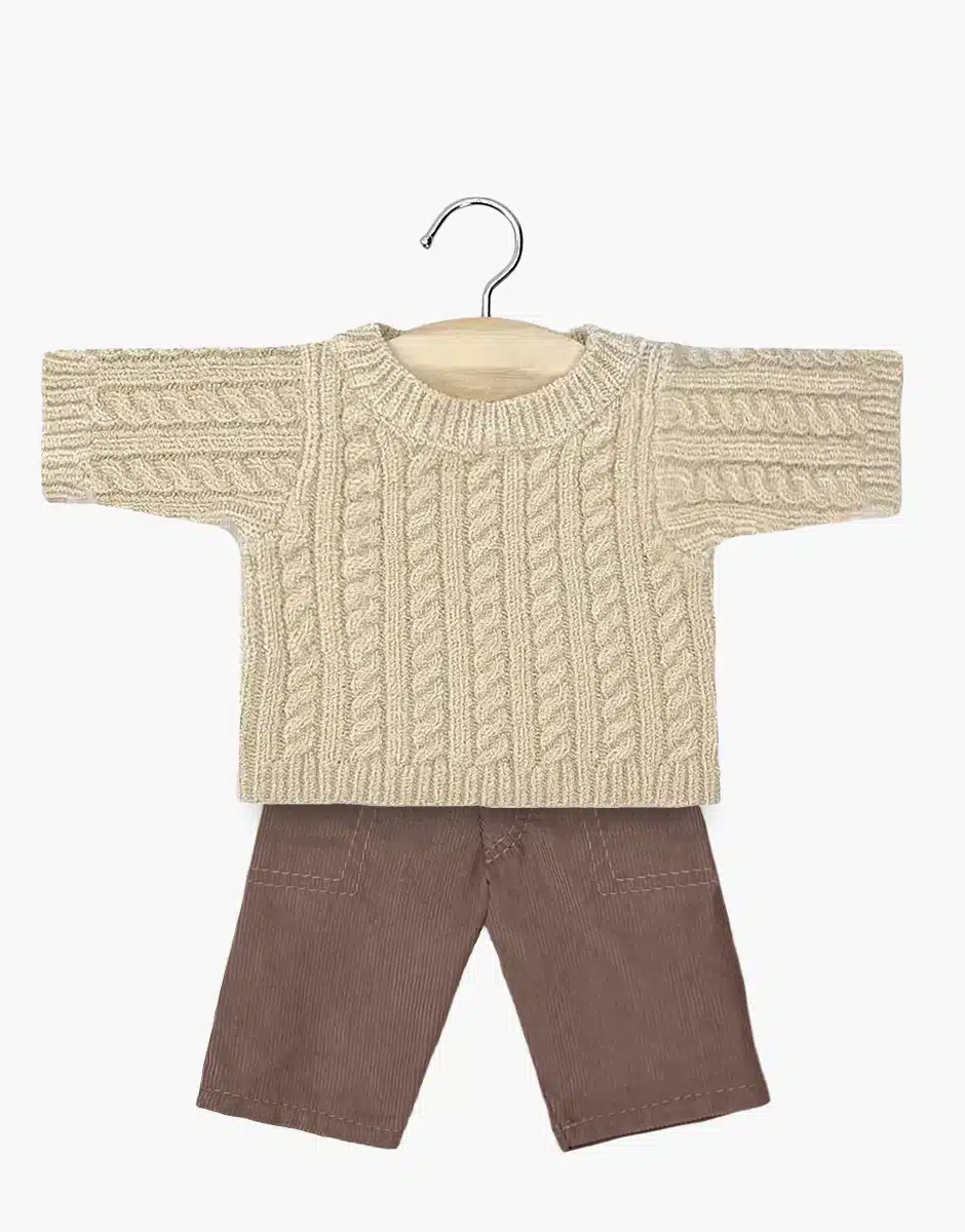 Antrekk til dukke - Strikkegenser og cordfløyelsbukse