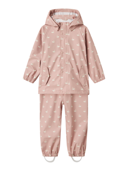 Beskrivelse Product Type : Rain set - Functionality : Waterproofness 10,000mm, Welded seams for a complete waterproof protection - Neck : Detachable hood - Sleeve : Long sleeves - Cuffs : Elasticated cuffs - Closing : Press stud fastening, Zip fastening - Pockets : Front pockets with zip fastening - Leg details : Detachable and adjustable foot loops made of durable rubber for a comfortable fit around the foot - Extra details : Detachable hood for safety, Zip guard to prevent the zip from taking hold of the skin - Wash/Finish : PFAS FREE - No fluorine compounds are used in our products - Print : Print repeated across the entire surface of the product |