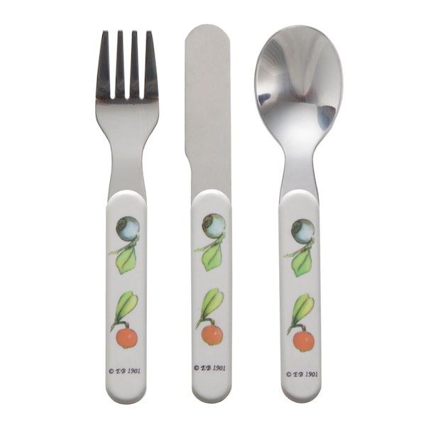 Beskrivelse Barnebestikk i tre deler med motiv fra Elsa Beskows verk Putte i blåbærskogen. Leveres i en praktisk gavepakning. Håndtak av melamin. Kan vaskes i oppvaskmaskin |