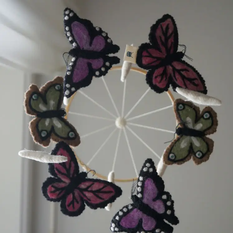 Beskrivelse Vakker og detaljert uro spesielt designet for de små som ligger under og kikker opp. Produktet er håndlaget – hvert produkt er derfor unikt, og små variasjoner i form forekommer. Produktet er laget av ull fra New Zealand og er av høyeste kvalitet. Fyllet er laget av resirkulert polyester. |