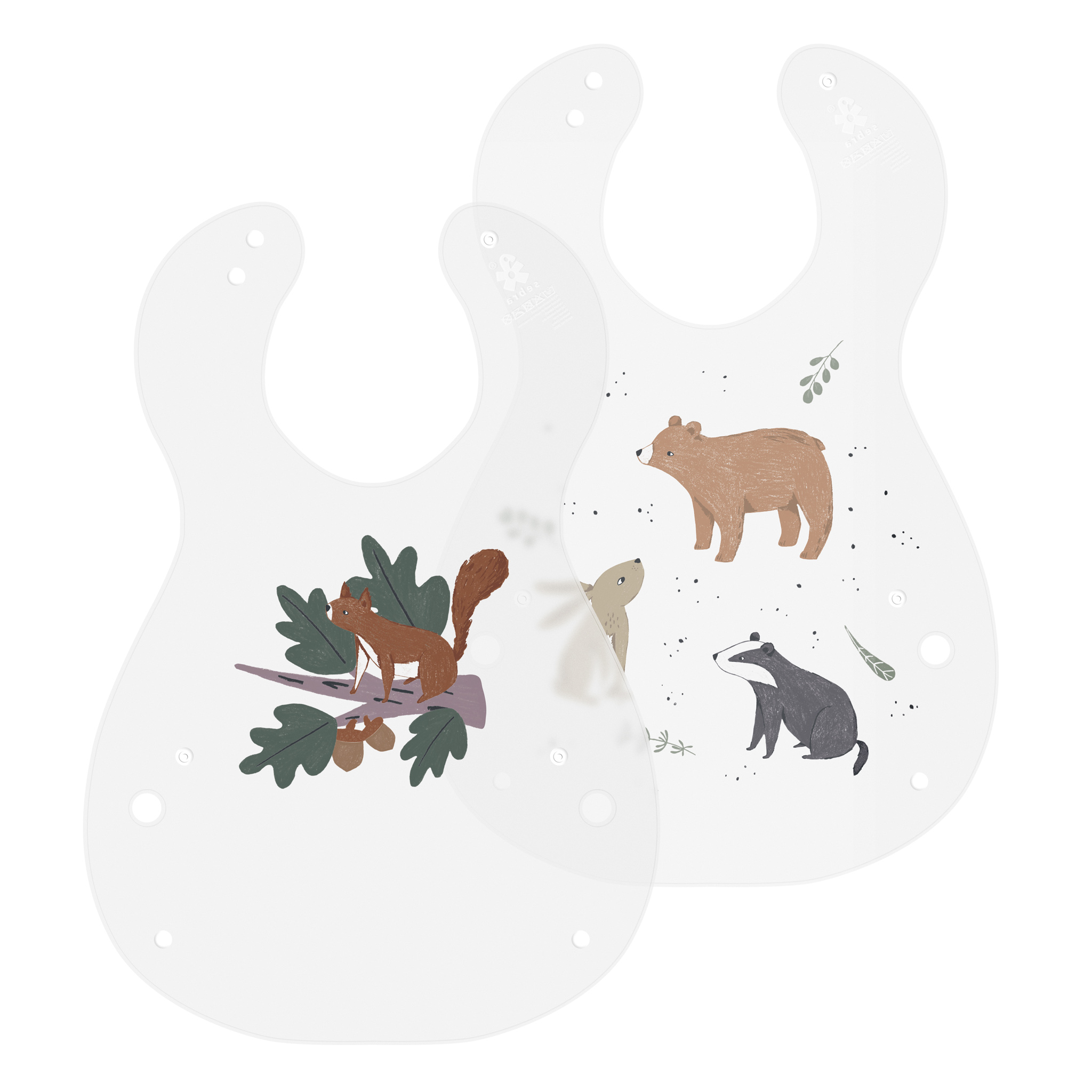 Beskrivelse De to smekkene har forskjellige motiver – én med ekornet Star som sitter på en lønnegren, og én med tre dyr: bjørnen Woody, haren Moonlight og grevlingen Shadow. Smekkene kan brettes opp for å danne en liten lomme/dryppskål for å samle opp smuler og væske. En utrolig praktisk lomme som fanger opp maten som ikke når munnen. Smekken kan selvfølgelig også brukes uten å brette lommen hvis du foretrekker en litt lengre smekke. Anbefalt alder: 4 måneder+ |