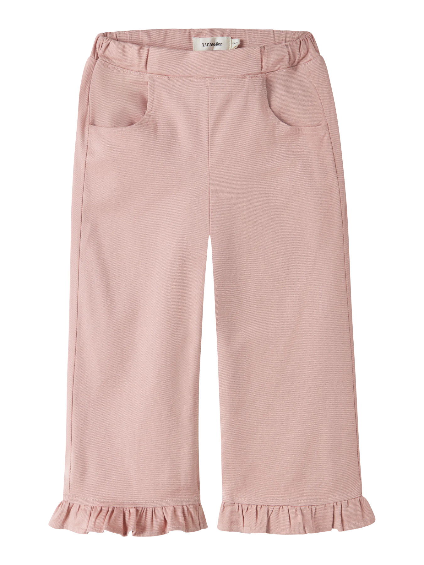 Beskrivelse Gi barnets garderobe en myk og stilfull oppdatering med et komfortabelt plagg som gir en avslappet og trendy hverdagslook. Produktdetaljer: – Produkttype: Bukse med vide ben – Lommer: Frontlommer – Bendetaljer: Volangkant nederst på bena – Ekstra detaljer: Justerbar midje og volangdetaljer – Passform: Vid passform med brede ben |