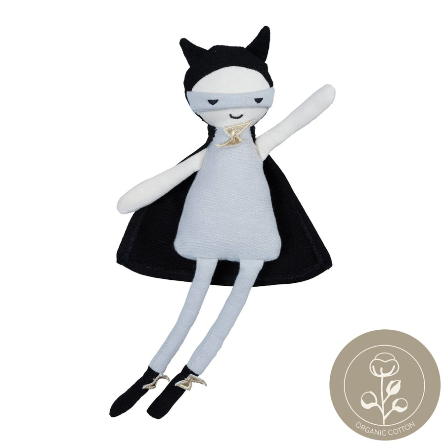 Beskrivelse Denne modige superhelten suser gjennom verden - til unnsetning for alle som ikke føler seg trygge eller glade. Med sin magiske maske og mørke kappe tar superhelten med seg sine venner for å kjempe for det de tror på. 28 cm 100% økologisk bomull Mais-fyll |