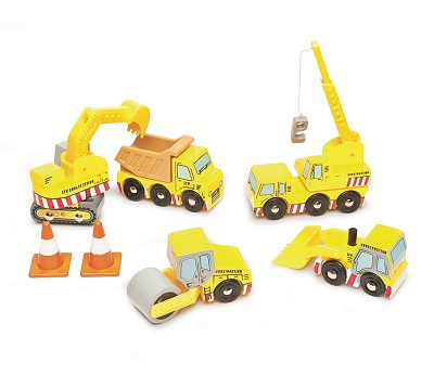 Beskrivelse I denne esken får du fem forskjellige anleggskjøretøy med forskjellige funksjoner; løftekran, gravemaskin, veivals, digger og lastebil. Det følger også med to kjegler til avsperring. Bilene er laget i malt tre og har gummihjul. Kommer i en fin gaveeske. |