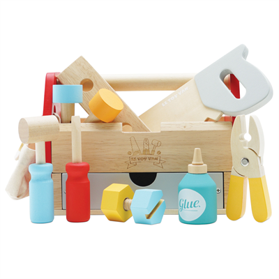 Beskrivelse Verktøykasse og verktøy fra Le Toy Van. Denne verktøykassen har tavle på den ene siden og skuff på den andre som kan fylles med det medfølgende verktøyet og annet utstyr. I tillegg til verktøykassen følger det med tang, skrutrekker, hammer, sag, lim, skruer, spiker, mutter og plate til å skru i. Både verktøy og verktøykasse er laget i solid tre. |