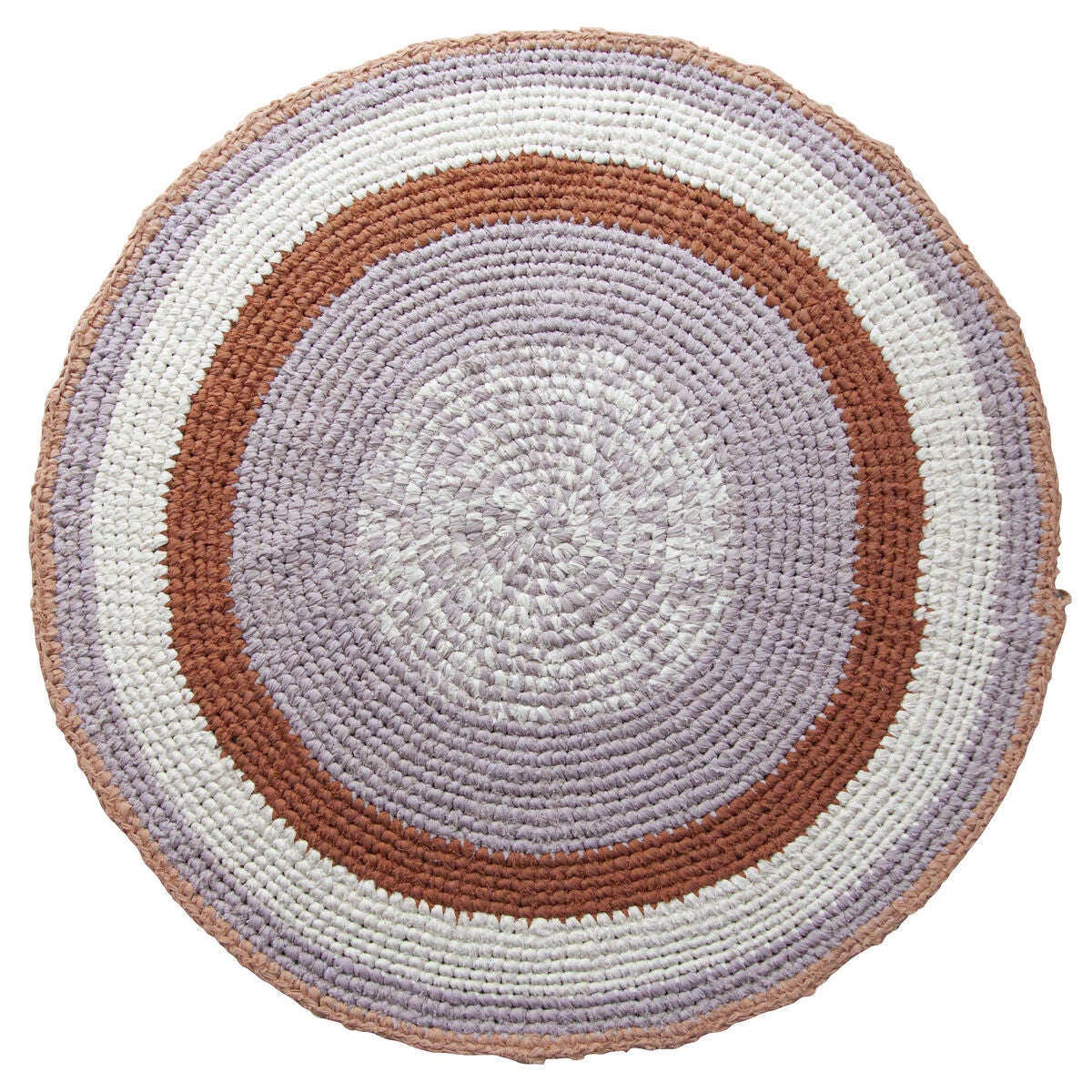 Beskrivelse Vakkert rundt heklet teppe med ringer i rustrødt, lilla, hvitt og rosa. Teppet måler 120 cm i diameter og utgjør en fantastisk base for bare små føtter som kommer seg ut av sengen om morgenen, eller kan brukes som lekematte for å leke på om ettermiddagen. Teppet kan brukes både på barnerommet, stuen, gangen eller hvor du ellers trenger et vakkert teppe. Teppet ble designet i Danmark og er håndlaget, så hvert teppe er unikt og har sin egen sjarm. Laget av 100 % bomull. Advarsel! Hold borte fra flammer |