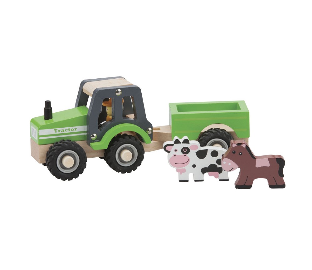 Beskrivelse Kul og solid leketraktor i tre. Traktoren har en sjåfør og henger som kan tas av og på. Det følger også med to trefigurer, en ku og en hest. Passer fra 1 år |