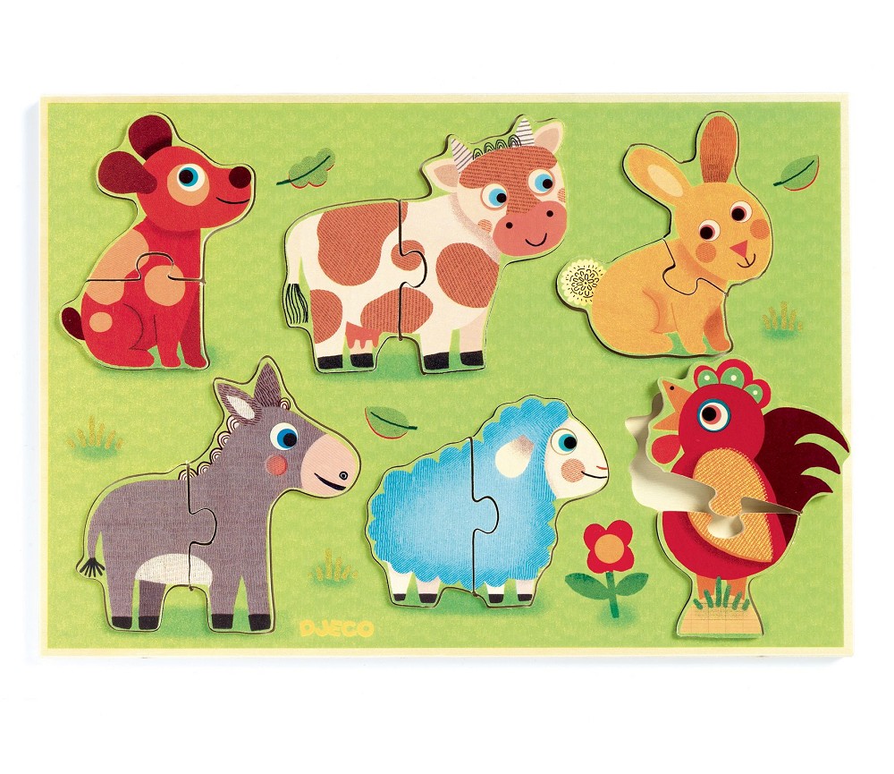 Beskrivelse Trepuslespill for de aller minste med seks bondegårdsdyr og 12 brikker. Plasseres i rammen, noe som gjør det lettere for de minste å få til puslespillet. |