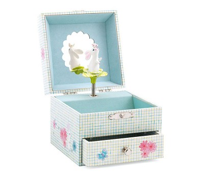 Beskrivelse Nydelig smykkeskrin fra Djeco med smårutete trykk med turkis innside. Kaninen som sitter i en blomst med en sommerfugl på nesten snurrer rundt til musikken som strømmer ut når du åpner skrinet. Skrinet har to rom og speil i lokket. Trekkes opp på baksiden. |