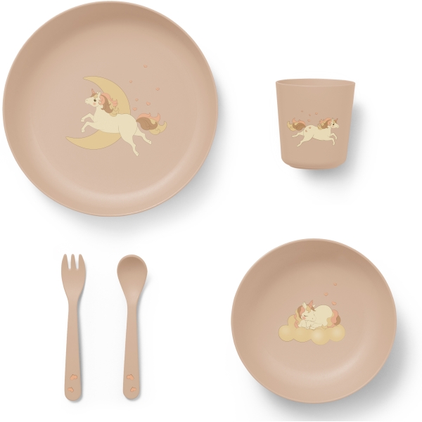 Beskrivelse Middagssett bestående av to tallerkener/skåler, en kopp, en skje og en gaffel som er lett for små hender å ta tak i. Mindre enn 3 minutter mikrobølgeovn i max 400W. Ikke bruk produkter på kokeplater eller andre varmekilder. Brukes under tilsyn av voksne. Tallerken: 19,1 x 35,5 cm Skål: 14,5,5 x 43,5 cm Kopper: 7,0 x 7,5 cm Bestikk lengde: 13,5 cm |
