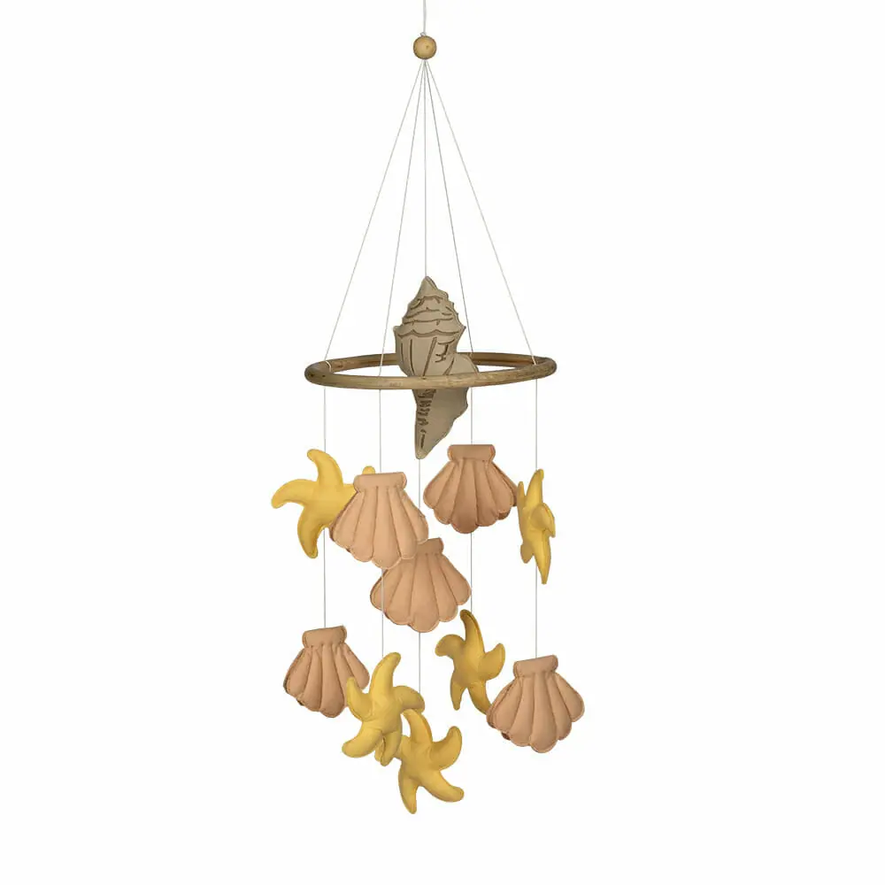 Beskrivelse Denne uroen er inspirert av havet. En flott konkylie er hoved-elementet, og den er omringet av sjøstjerner og skjell. Laget av 100% økologisk bomull. For å unngå sammenfiltring er noen av snorene bundet sammen - sørg for at du klipper riktig snor. |