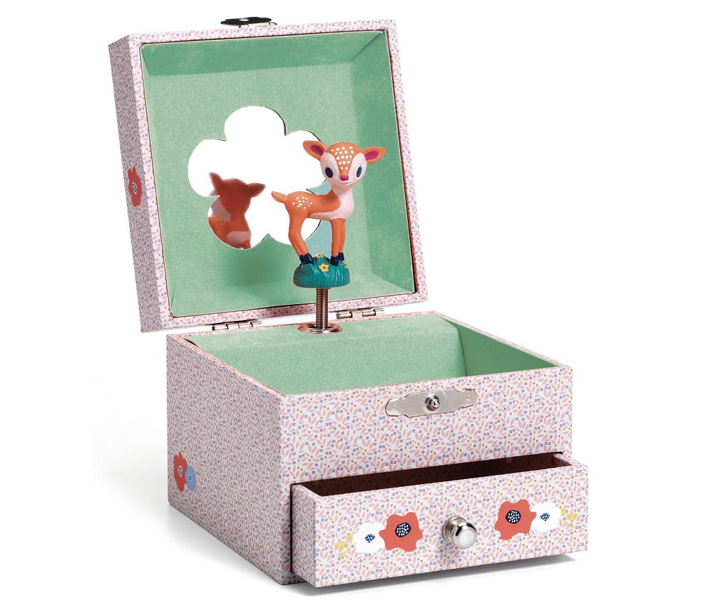Beskrivelse Nydelig smykkeskrin fra Djeco i en lys lillafarge med grønn innside. Rådyret snurrer rundt til musikken som strømmer ut når du trekker den opp. Skrinet har to rom og speil i lokket. Trekkes opp på baksiden. En flott gave som gleder lenge. Spilledåsen spiller “The Magic flute” av Mozart. |
