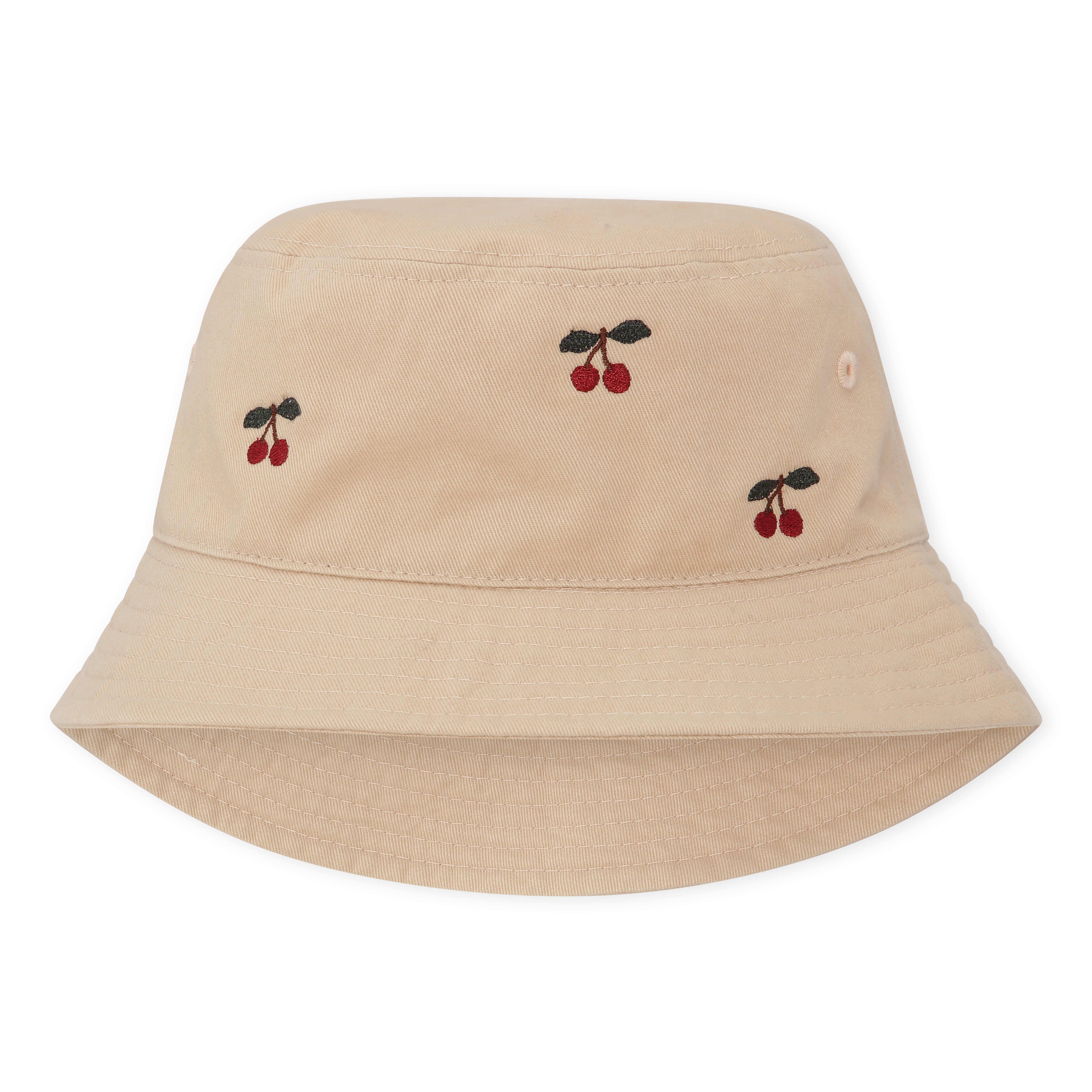 En helt skjønn bøttehatt med broderte kirsebær på.