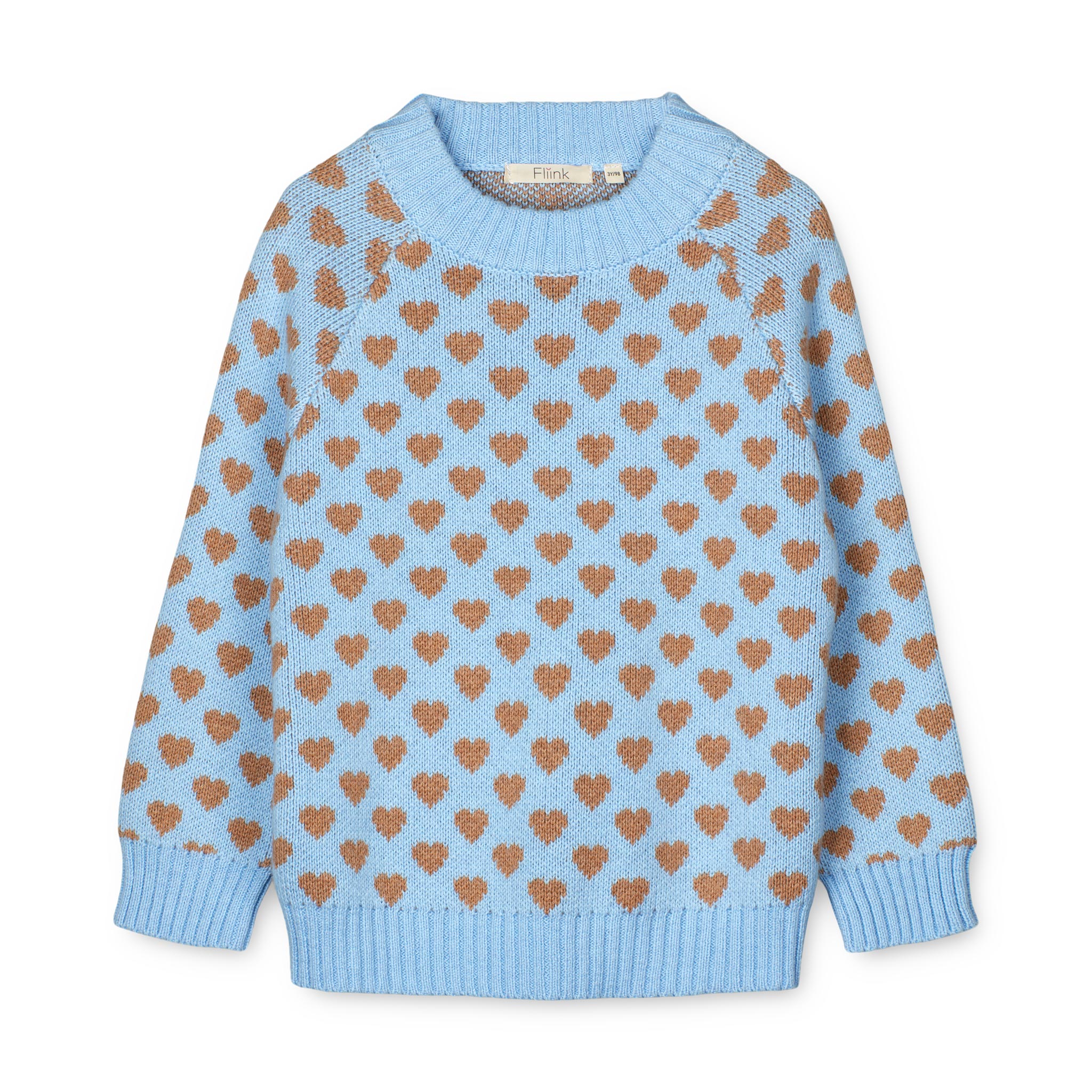 En helt nydelig genser med lyseblå base og brune hjerter. Den er strikket, og utrolig myk og behagelig å ha på seg.