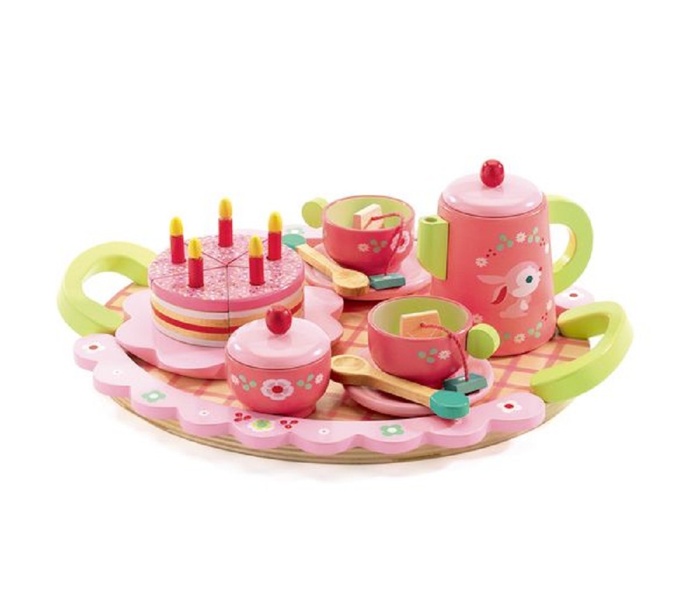 Beskrivelse Med dette kule settet fra Djeco kan barnet servere te og kaffe til bamsene, dukkene eller noen heldige foreldre. Her er alt laget i solid tre og malt i giftfri, trygg og fargerik maling. Settet består av et serveringsbrett, tekanne, to tekopper med skål og teposer, skål til sukkerbiter og annen snacks og en bløtkake med bursdagslys. Kaken er delt opp, slik at den kan serveres stykkevis. Stor stas og et populært tilbehør til rolleleken! |