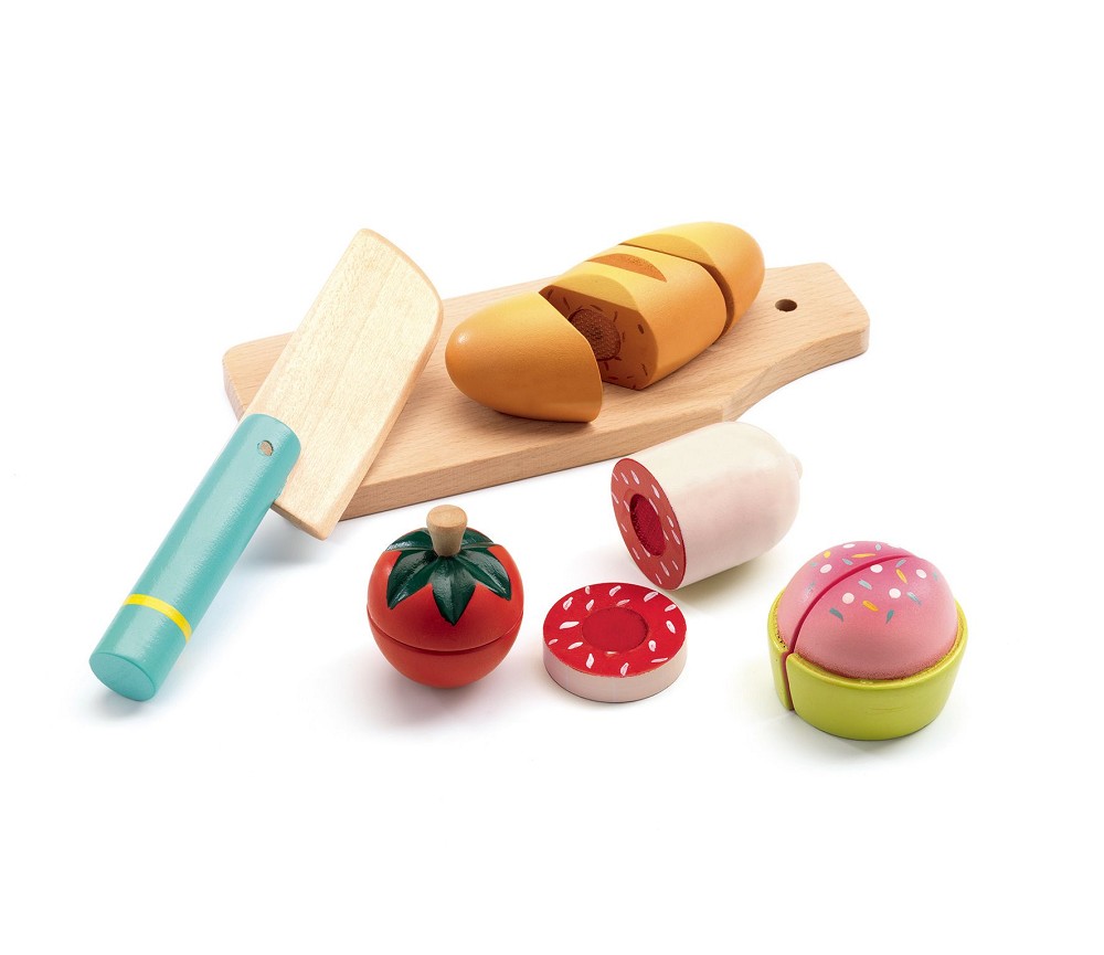 Beskrivelse Lekemat er en sikker vinner! Nydelig sett med frokostmat i tre fra Djeco. Her får du brød, salami og tomat, en liten kake til dessert, en brødfjøl og en kniv. Alt i solid tre! Maten er satt sammen med borrelås, slik at den lille kan bruke lekekniven for å skjære opp og så sette den sammen igjen. Denne lekematen hører hjemme på ethvert lekekjøkken. |