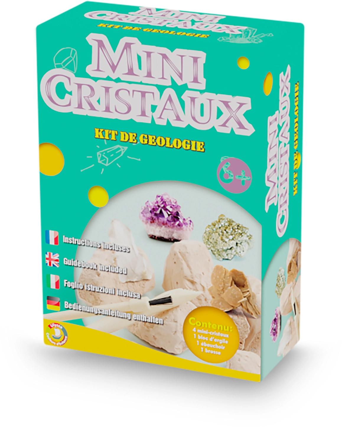 Beskrivelse Settet inneholder 4 minikrystaller begravet i en leireblokk. En kort guide er også gitt; med en beskrivelse av de 12 forskjellige krystallene som tilbys: kvarts, ametyst, citrin, røykkvarts, pyritt, ørkenrose, kyanitt, dolomitt, stjerneglimmer, ametystklynge, kalsitt og en geode. Instruksjoner på fransk, engelsk, tysk og italiensk. |
