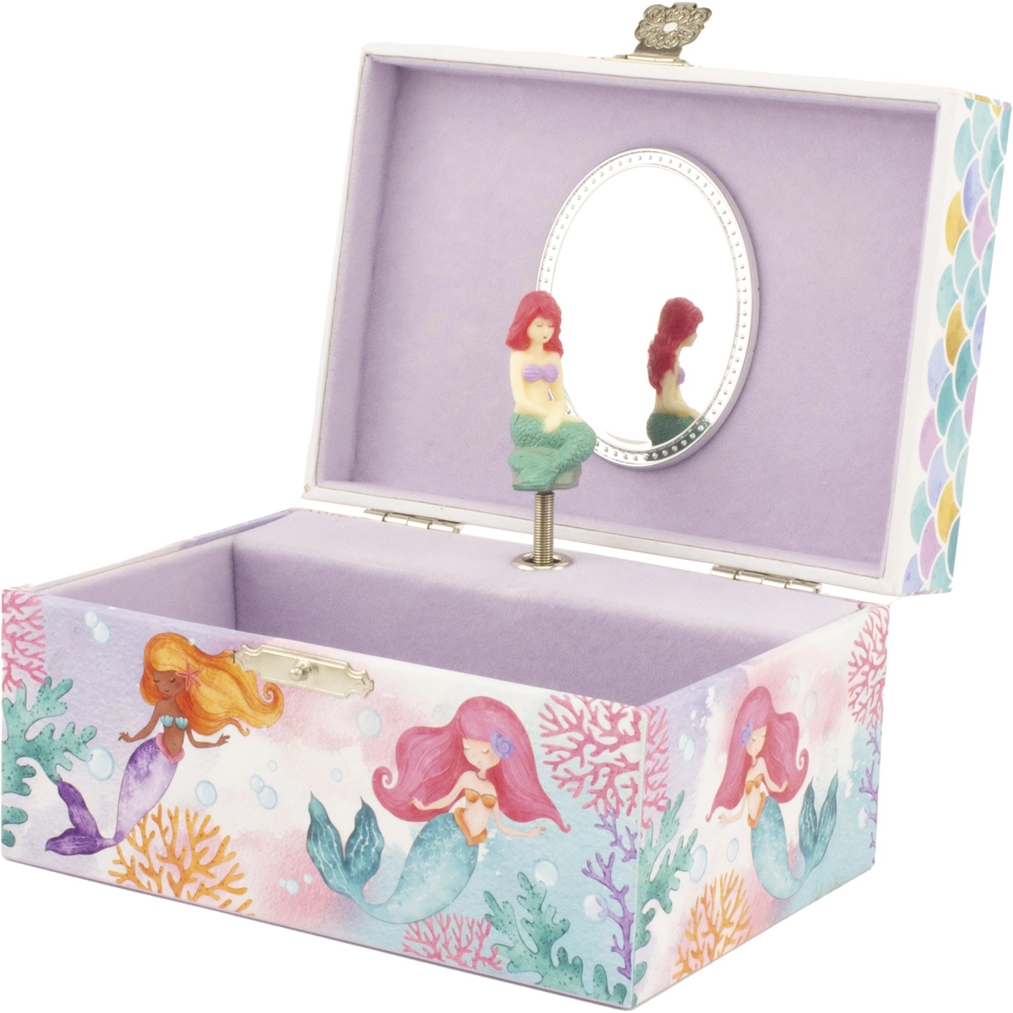 Beskrivelse Nydelig smykkeskrin fra med havfruer. Havfruen inne i skrinet snurrer rundt til musikken som strømmer ut når du åpner det. Trekkes opp på baksiden. En herlig gave som gleder lenge. Melodi: “The Pearl Fishermen” av Georges Bizet. |