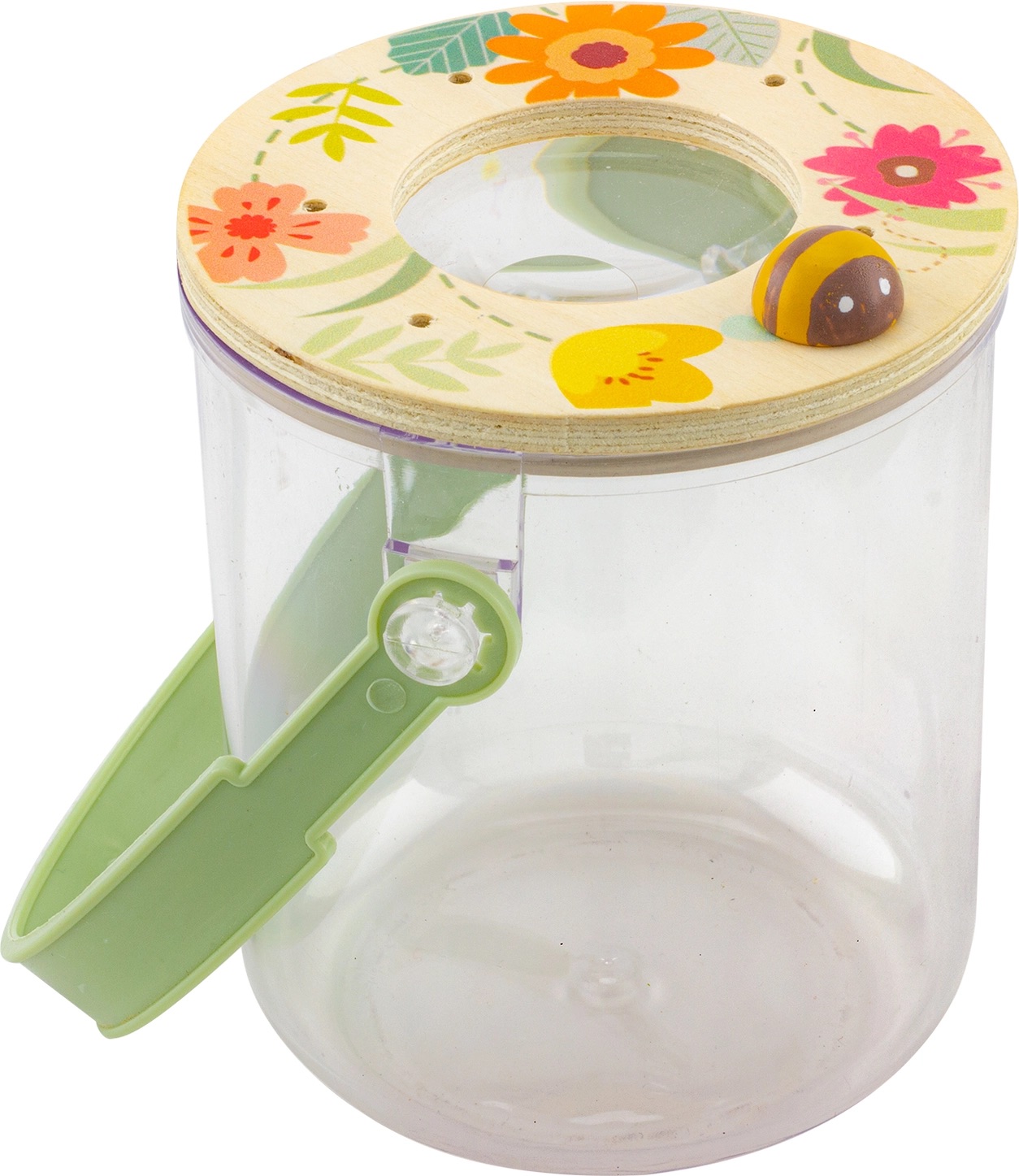 Beskrivelse Nydelig insektglass med lokk med forstørrelsesglass i to forskjellige forstørrelser samt håndtak. Lokket har små hull som lar insektene puste. Lokket holdes på plass med en gummipakning. En spennende måte for barna p observere naturen! |