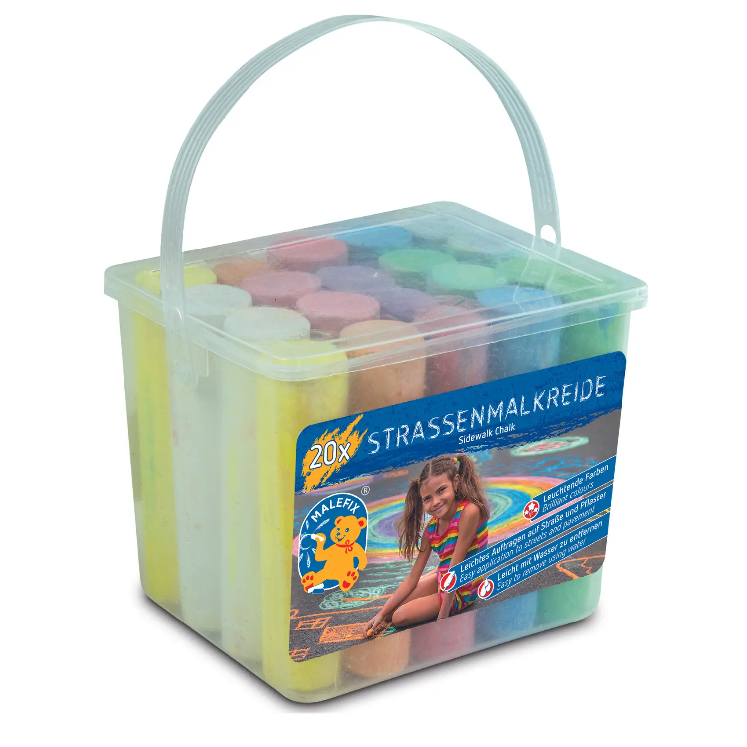 Beskrivelse En pakke med 20 gatekritt av høy kvalitet. Krittene er i forskjellige, lyse farger og er enkle å bruke - og enkle å fjerne med vann. Perfekt til paradis og annen gatekunst! |